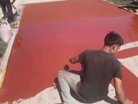 施工流程:先对地面进行打磨清理,确保基层平整、干燥、无油污;然后涂刷环氧树脂底漆,增强附着力;接着在底漆未干时均匀撒布彩色陶瓷颗粒,待完全固化后,清扫掉未粘结的颗粒。
